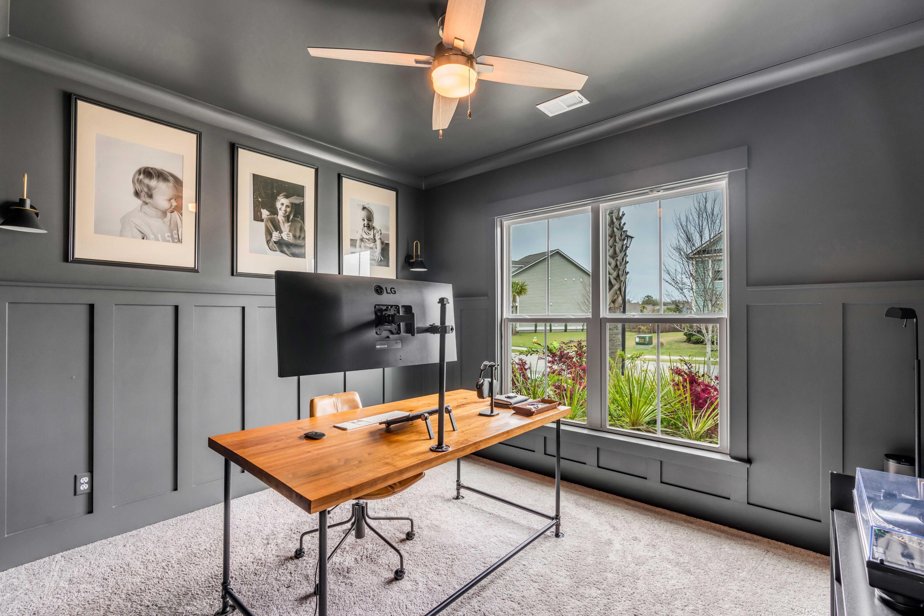 Nestled on one of the largest lots in Oakfield at 0.35 acres, this exceptional 5-bedroom, 4-bathroom home is a true standout, offering high-end designer finishes and backing up to a protected wooded area for ultimate privacy. Thoughtfully designed with both elegance and comfort in mind, this home features fresh paint throughout, striking color-drenched rooms, elegant wallpaper, and brand-new high-end lighting that adds a sophisticated touch to every space. Best of all, this home is located in an X-flood zone, meaning no flood insurance is required, and the HOA dues are just $170 per quarter.As you approach the home, you're greeted by a charming covered front porch with a hanging gas lantern, exuding classic Southern charm. Stepping inside, soaring 9ft+ ceilings in the foyerset the tone for the open and airy feel of the home. To the left, a separate formal dining room with elegant wainscoting is perfect for hosting dinner parties or family gatherings. To the right, the first-floor guest room, currently styled as an office, offers versatility and easy access to a cozy full bathroom, making it an ideal space for guests or remote work.